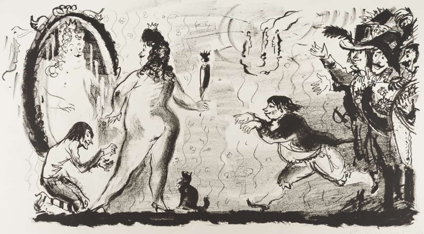 His chamberlains, who were to bear his train, groped along the floor with their hands, as if they were picking up the train, they walked forward holding the air, they didn’t dare let anyone notice that they couldn’t see anything.