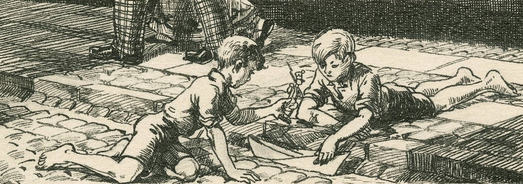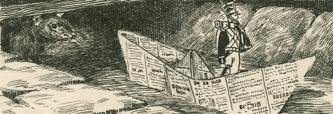 So they made a boat out of a newspaper, placed the soldier in the middle of it, and off he sailed down the gutter; both boys ran alongside, clapping their hands. Goodness gracious! what big waves there were in that gutter, and how strong the current was – well, it had just been pouring down. The paper boat bobbed up and down, and at times it spun round so fast that the tin-soldier was all of a quiver, but he remained steadfast, didn’t bat an eyelid, gazed straight ahead and held his rifle still shouldered.