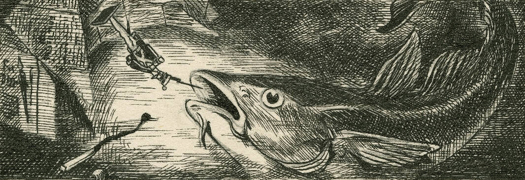 Now the paper disintegrated, and the tin-soldier fell through, but at that instant he was swallowed by a large fish.