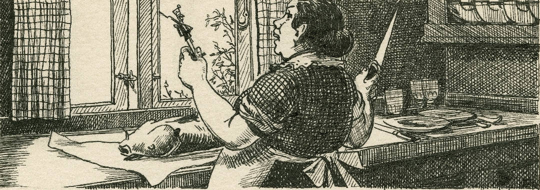 The servant maid and the little boy came down at once to look for him, but even though they almost trod on him, they couldn’t see him. If the tin-soldier had shouted: ‘I’m here!’ they would probably have found him, but he didn’t feel it was appropriate to cry out loud, as he was in uniform.