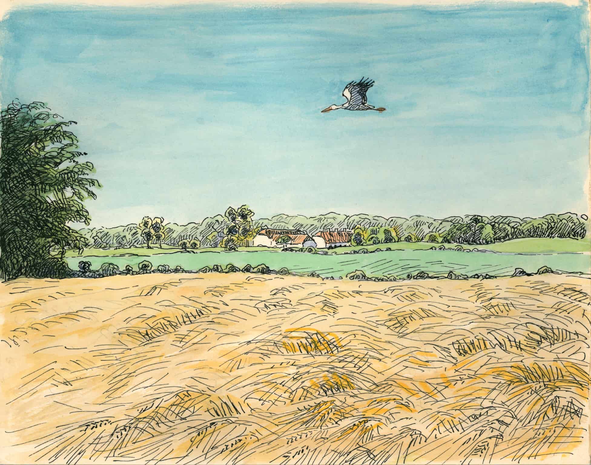 It was not until well into the day that everything fell silent, but the poor young creature didn’t dare get up, it waited several more hours before taking a look around and then hurrying away from the marsh as fast as it could: it ran across field and meadow, there was such a strong wind that it found it difficult to make any progress.