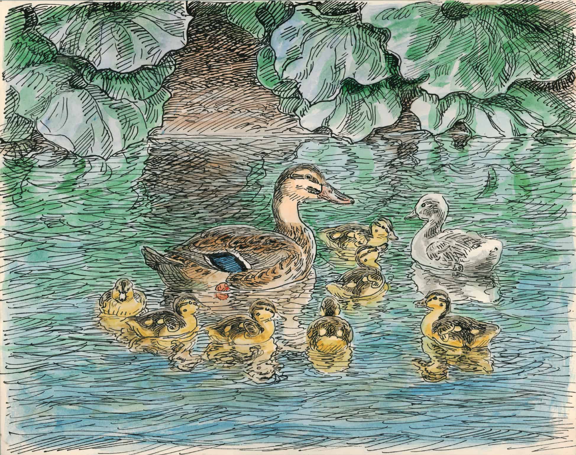 ‘The other ducklings are most attractive!’ the old duck said, ‘just make yourself at home, and if you find an eel’s head, you can bring it to me!’ –