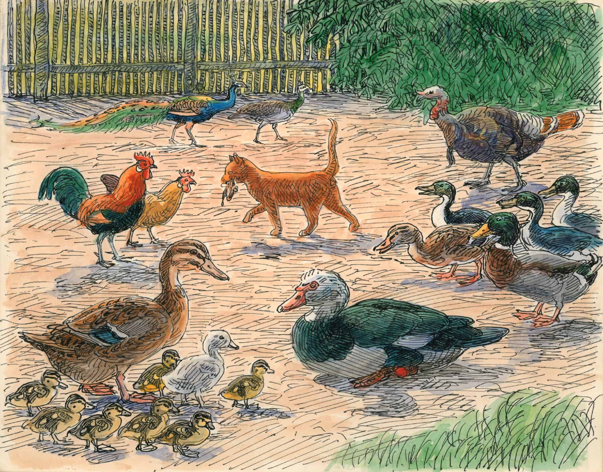 And then they went into the duckyard. There was a terrible racket going on in there, for two families were fighting over an eel’s head, and the cat ended up getting it.