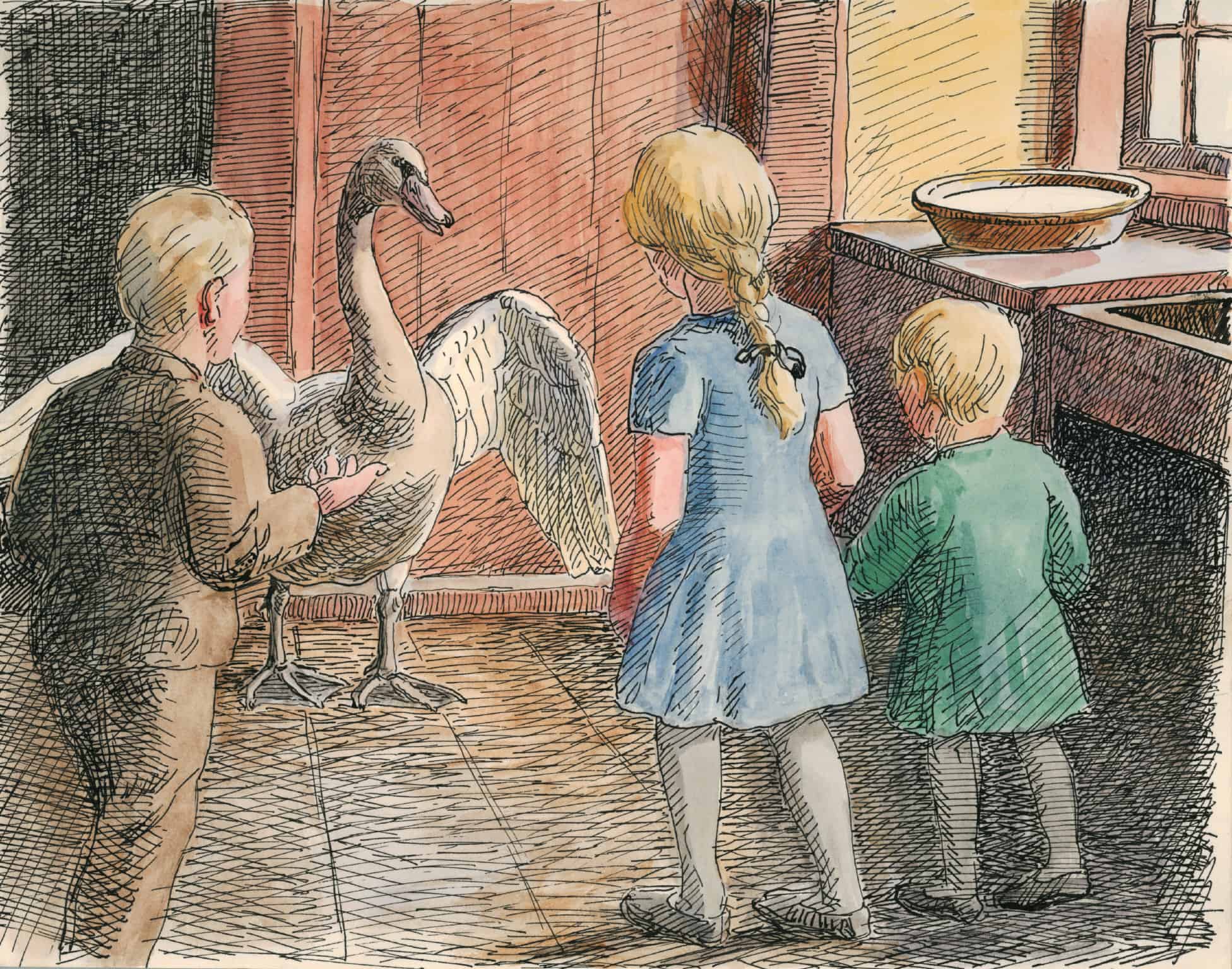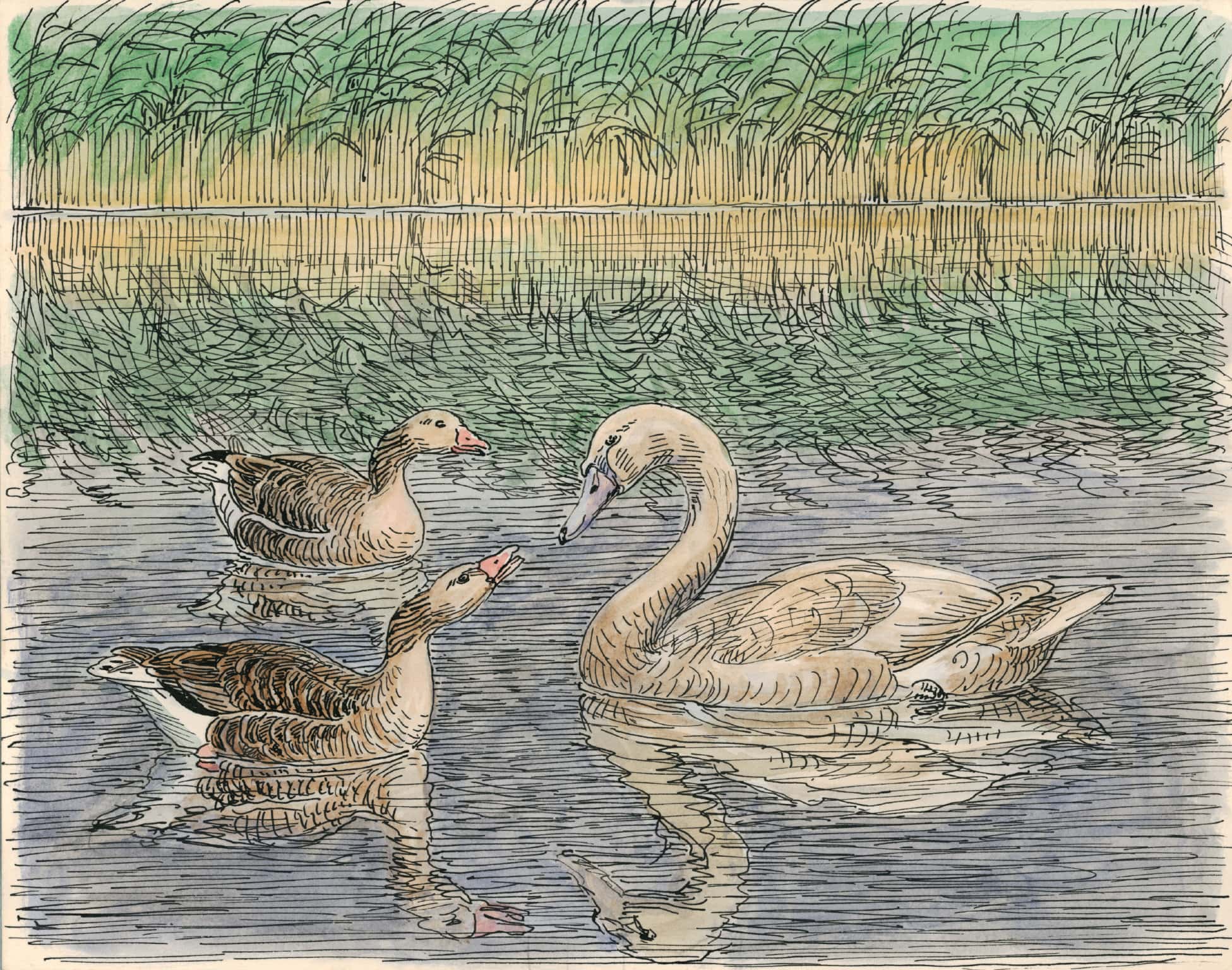 He lay there for two whole days, and then two wild geese arrived – or rather, wild ganders, for they were both males – they had hatched out of the egg not long since, and that was why they were so brisk about things.