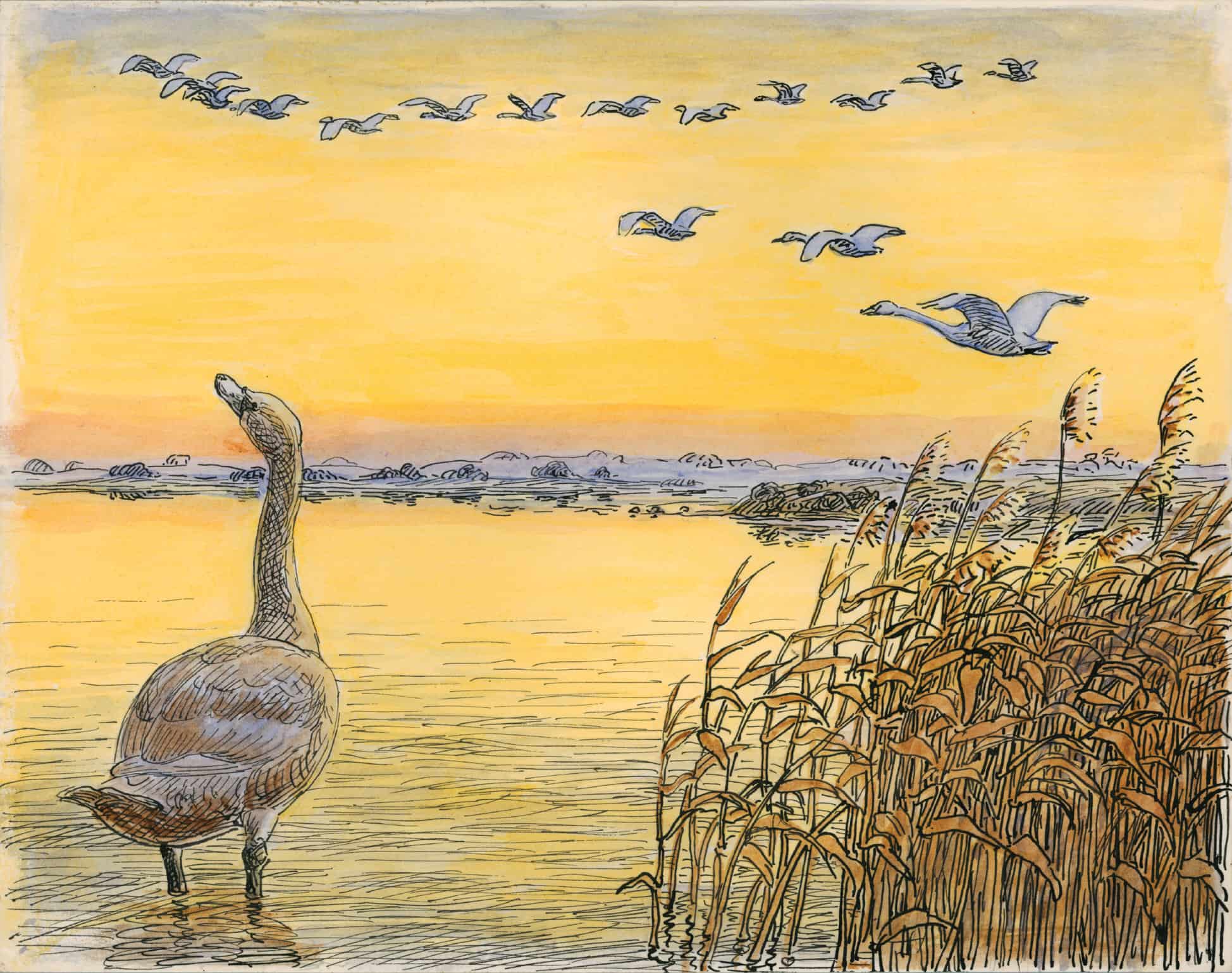 In the morning the wild ducks flew up, and they looked at their new companion, ‘What are you meant to be?’ they asked, and the duckling turned this way and that and greeted them as best it could.