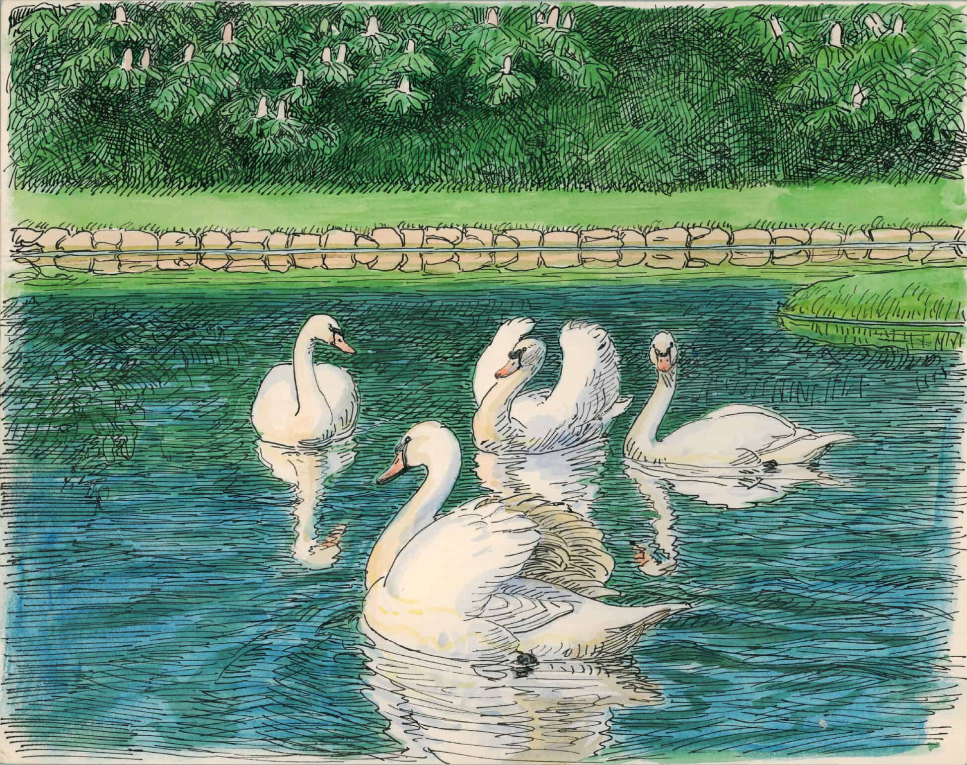 One evening, the sun was setting so beautifully, a whole flock of beautiful large birds came out of the bushes, the duckling had never seen anything as beautiful, they were gleaming white, with long, supple necks; they were swans. They let out a very strange sound, spread their magnificent, long wings and flew away from the cold clime to warmer countries, to open lakes! they climbed so high, so high, and the ugly duckling felt so very strange, it spun round in the water like a wheel, stretched out its neck high into the air after them, let out a cry so loud and strange it even felt scared itself at the sound of it. Oh, it couldn’t forget those lovely birds, those blissful birds, and as soon as it could no longer glimpse them, it dived down to the bottom, and when it came up again, it was as if it was beside itself. It didn’t know what the birds were, nor where they were flying off to, but it felt fonder of them that it had ever felt of anyone; it did not feel envious of them at all, how could it ever dream of wishing for such beauty, it would be happy if only the ducks had put up with having it among them! – the poor, ugly creature!